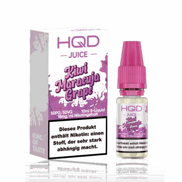 HQD JUICE – Kiwi Maracuja Grape bietet ein aufregendes, fruchtiges Geschmackserlebnis mit einer perfekten Balance aus Süße und Frische.