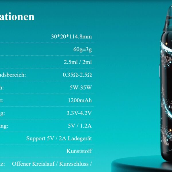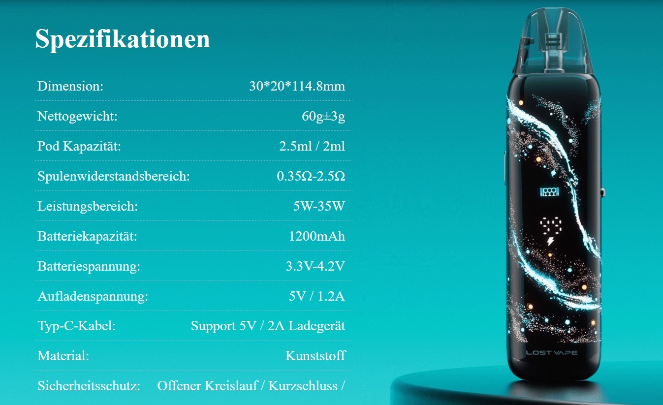 Der fest verbaute 1.200 mAh Akku liefert bis zu 35 Watt Leistung, die automatisch an den eingesetzten Pod angepasst wird. Geladen wird per USB-C (5V/1A).