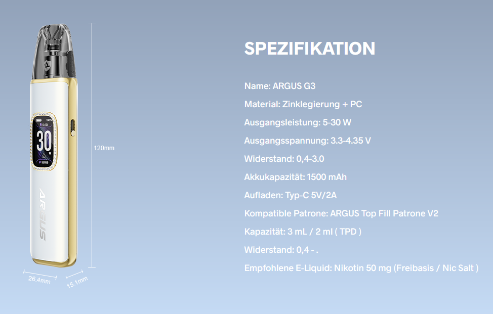 Das Argus G3 Kit ist das perfekte Pod-System für alle, die Wert auf einfache Bedienung, starke Performance und stylisches Design legen. Mit nur 65 g Gewicht, einem brillanten 0.96″ Farbdisplay und einem leistungsstarken 1500 mAh Akku ist es ein echter Alltagsheld – ob für Einsteiger oder erfahrene Dampfer.